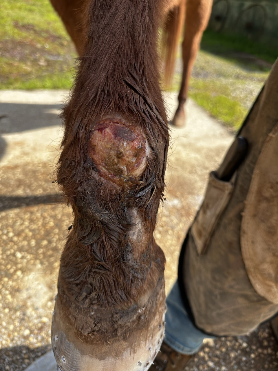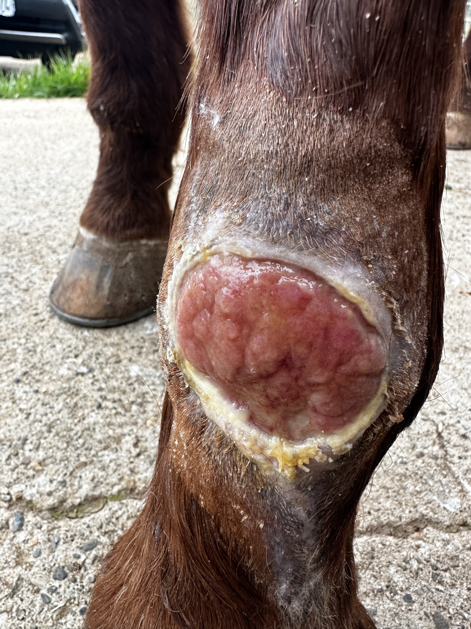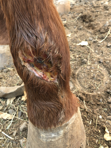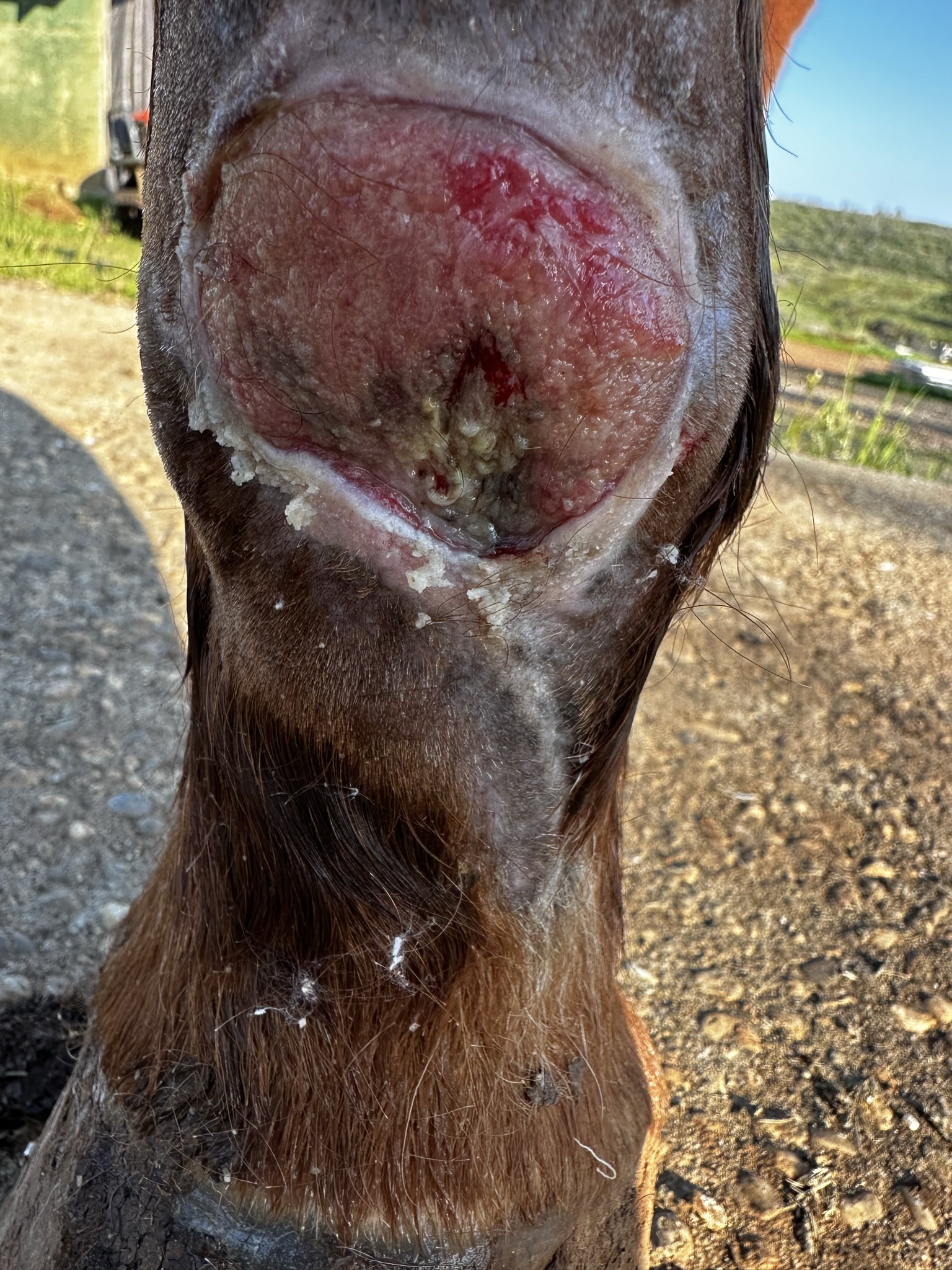 Camp Fire-the gift that keeps on giving-ugh! Cowboy's leg has re-opened and gotten infected yet again. The original would injury from 2018 picture is down at the bottom of the page-it's pretty nasty and definitely not a sight for the faint of heart! Fair warning!