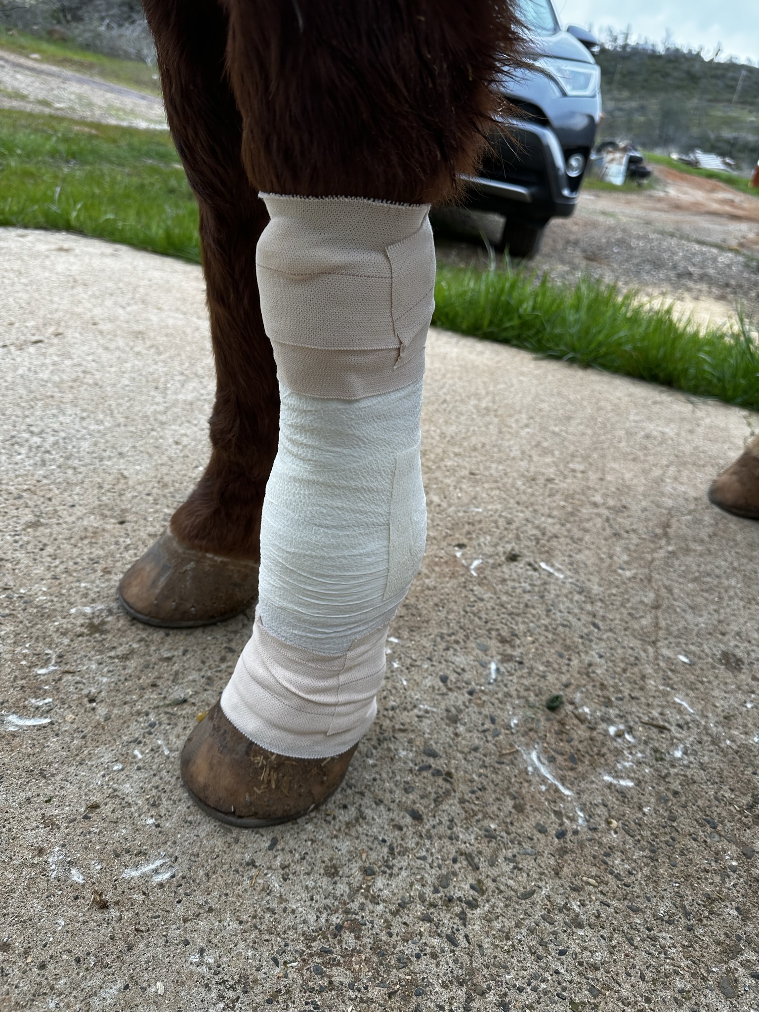 We went for an awesome ride at Bidwell Park on Saturday the 18th-everything was fine with his leg. The following days however was another deluge of rain. On Thursday it was farrier day-I began to take off his muddy nasty shield and was met with an open, painfully infected wound...again!