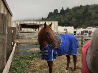 The kind volunteer at ride camp directed us to where we were to park. I hopped out of the truck, while N was getting direction to back in. It was at this moment that Lady Z, the gal in the next trailer, some 10 or more feet away, lost her mind. On and on she went, while in my head, my thoughts were, "wow, how close to the edge she is treading!" We have only snacked on food, have been on the road for the better part of 7 1/2 hours, horses aren't even out of the trailer and we were directed to park here! In my low blood sugar moment, I found this absolutely hysterical and of course laughed out loud! Off in a huff she went and we carried on with parking and getting our horses out of the trailer. They were overjoyed to see green grass in every direction and come to find out-joy of joys, there was one corral left which we quickly put our horses in, got them settled with hay and then proceeded to set up camp. By this time, it's dark, the temperatures were at least 40 degrees cooler than back in Paradise. Although I don't normally blanket Cowboy, it was a must with the temperature difference. I hadn't previously tried this sheet on Cowboy, but I somehow managed to get it on him correctly and he was kind enough to calmly stand there while I did. As a side note, the following evening while there was still daylight, it took twice as long to get the darn thing on! Go Figure!